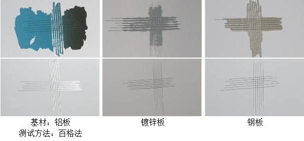 金屬烤漆附著(zhù)力促進(jìn)劑的應用可以有效的改善油漆漆膜對各種難附著(zhù)金屬如鋁(鋁合金)、鋅(鋅合金)、不銹鋼等的附著(zhù),增加漆膜的延展性與耐沖擊性能,高溫烘烤不會(huì )變色,通過(guò)底材與漆面之間的牢靠附著(zhù)力性能,解決金屬底材噴烤漆掉漆或百格附著(zhù)力、鹽霧、水煮、高溫等附著(zhù)力測試通過(guò)不了的問(wèn)題。